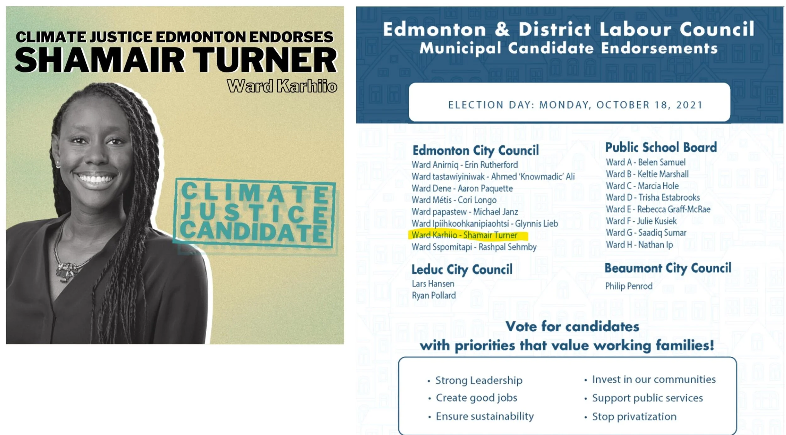 Endorsements Media Keith Gerein: Will 2021 provide an election breakthrough for women, racialized candidates? Could Shamair Turner be Edmonton’s first Black woman on city council? Ten months away, the candidates for Edmonton’s 2021 election look very different. Alberta Leaders Series: Shamair Turner Outside The House With Shamair Turner and Adrian Bruff